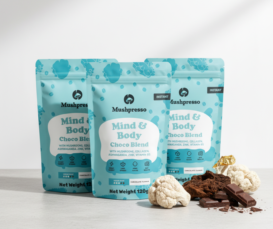 гъбите са древната суперсила на природата, няма съмнение! нашата мощна смес от 2 основни екстракта от гъби, комбинирана с матча и колаген има силен адаптогенен ефект върху тялото и ума. Тези съставки се използват от хиляди години по целия свят и въздействието им е научно доказано безброй пъти.